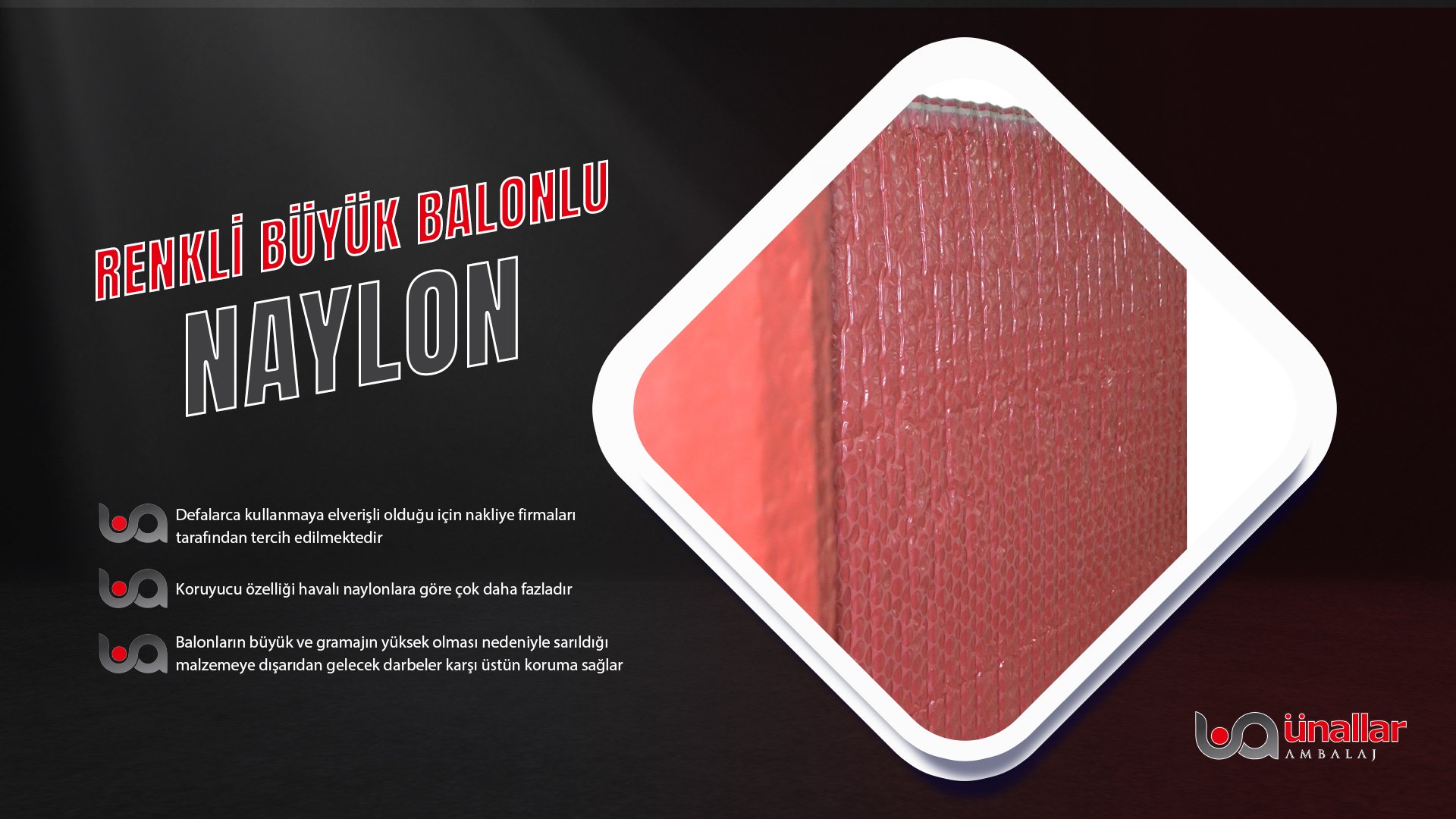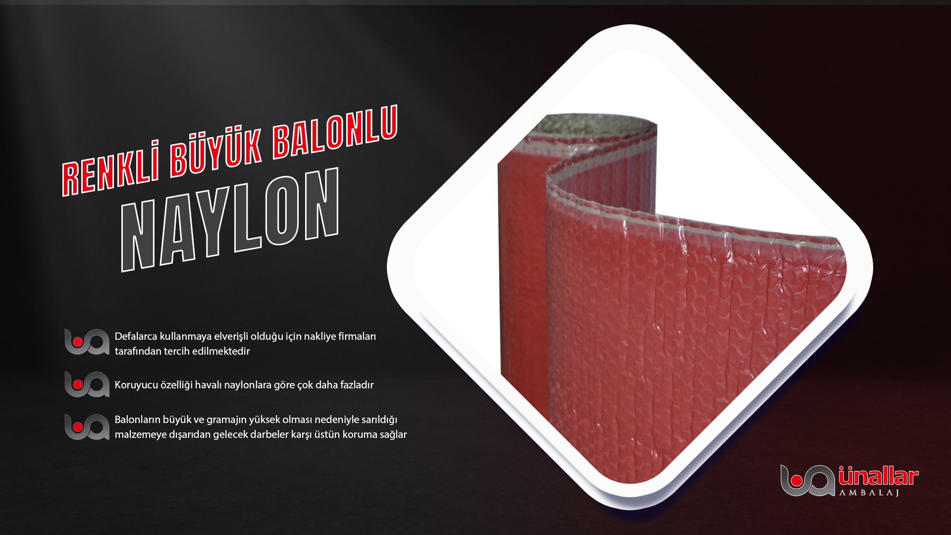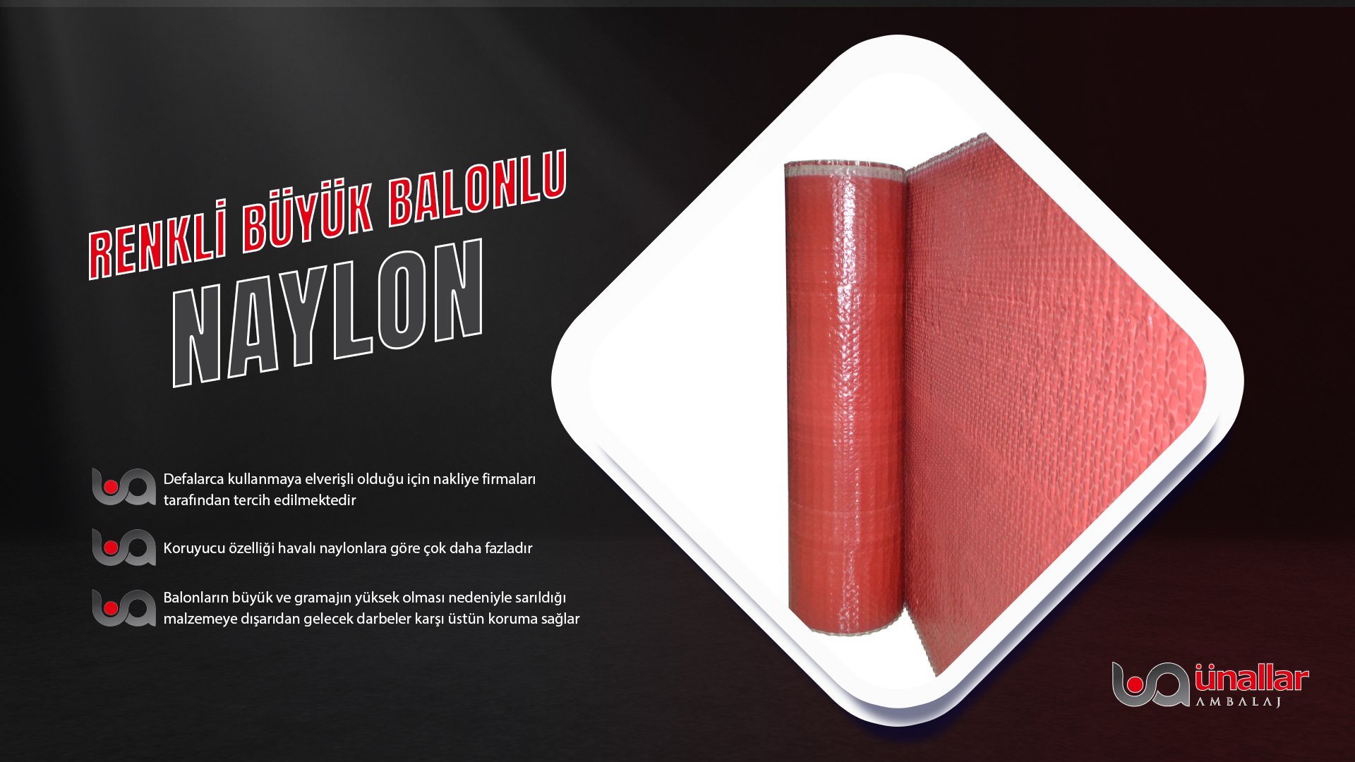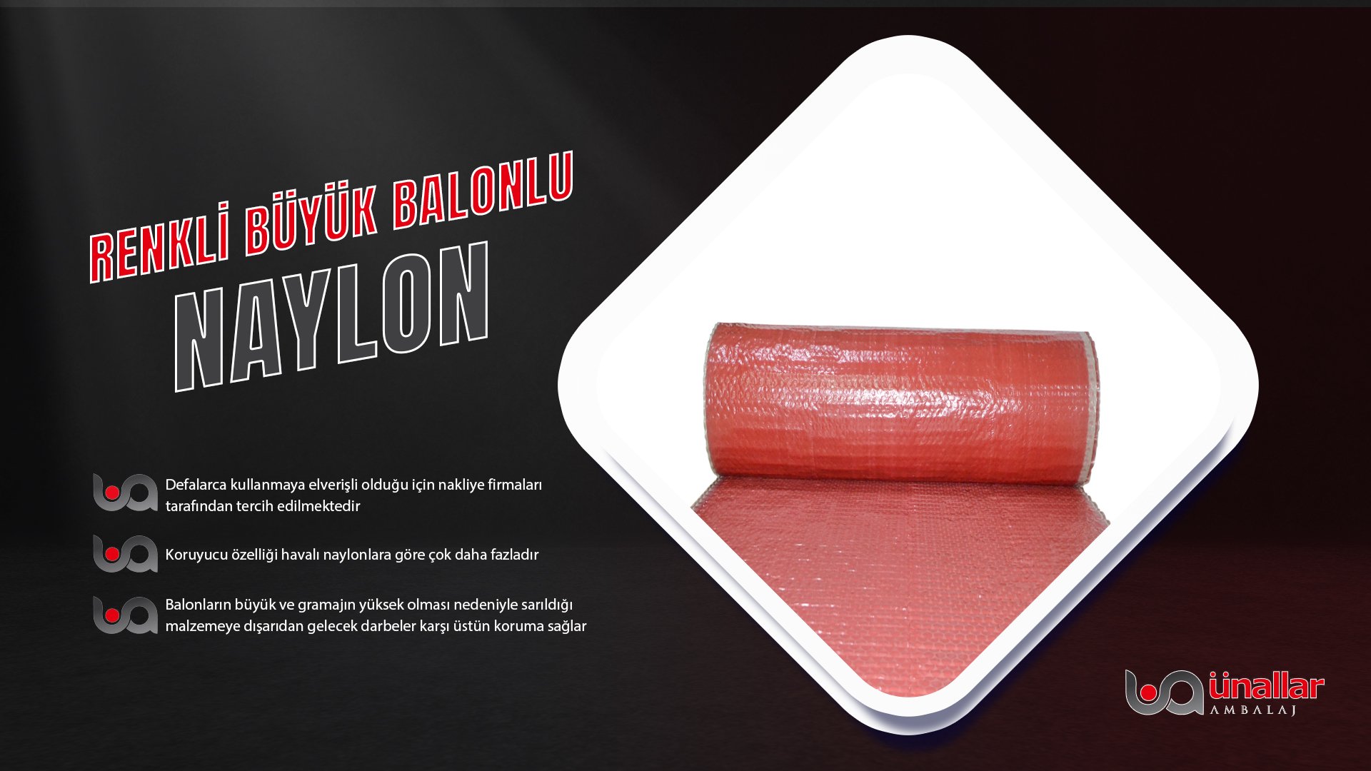 Büyük balonlu havalı naylonun içeriğine renklendirici malzemeler katılarak elde edilmektedir. Ürünlerinizin diğer firmaların ürünleriyle karışmasını önlemek için size özel bir renk kullanabilirsiniz. Ya da kendi eşyalarınız arasında belirleyici bir ambalaj malzemesi olarak kullanabilirsiniz. Büyük balonlu havalıya göre kalitesinde hiçbir fark bulunmamaktadır. Sadece belirginliği arttırıcı bir ürüdür.